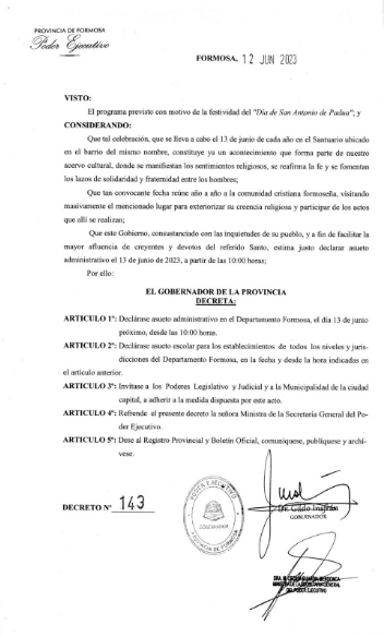 El señor Gobernador Gildo Insfrán declara asueto administrativo y escolar para todos los niveles en el departamento de Formosa para el día 13 de junio, desde las 10 hs. El señor Gobernador Gildo Insfrán declara asueto administrativo y escolar para todos los niveles en el departamento de Formosa para el día 13 de junio, desde las 10 hs.