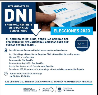 Por los comicios de este domingo 25 de junio, todas las oficinas del Registro Civil de toda la provincia permanecerán abiertas ese día, en el horario de 8 a 17 horas, para que las personas puedan retirar el DNI.