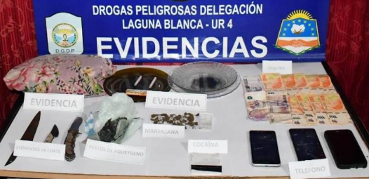 La investigación comenzó días atrás por la viralización de un video que mostraba que tres hombres obligaban bajo amenaza a una persona con retraso madurativo a consumir drogas. Los integrantes de la Dirección General de Drogas Peligrosas, Delegación Laguna Blanca, realizaron pesquisas y recolección de evidencias. Luego reunieron elementos de pruebas y todo fue puesto en conocimiento del juez de Instrucción y Correccional N° 2 de la Segunda Circunscripción Judicial de la Provincia, quien valoró el trabajo y otorgó la orden de requisa domiciliaria. Allanamiento El miércoles alrededor de las 14 horas, efectivos de la Dirección General de Drogas Peligrosas, Delegación Laguna Blanca, con la colaboración de la brigada de investigación y comisaría Laguna Blanca, allanaron una vivienda del barrio Gendarmería Nacional de esa localidad. Como resultado de la requisa, se secuestraron varios gramos de marihuana y cocaína, elementos de cortes, tres aparatos de telefonía, elementos de acondicionamiento de la droga y dinero, entre otros elementos. También se detuvo a tres sujetos de 21, 22 y 26 años, sindicados como responsables del hecho. De esta manera, se desarticuló un centro de distribución de estupefacientes, mientras que los secuestros y los detenidos quedaron a disposición de la Justicia.