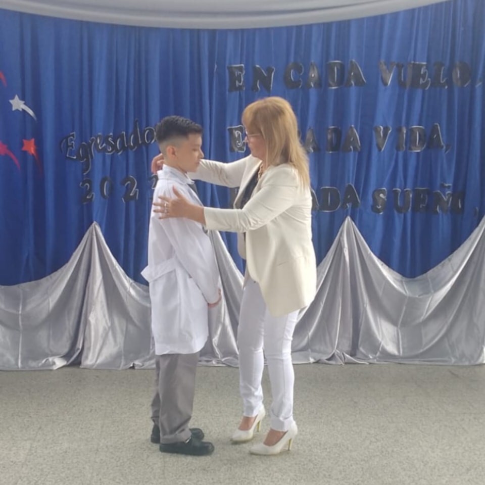 En el marco del Acto de Finalización del Ciclo Lectivo 2023 llevado a cabo en La EPEP N° 514 del Barrio República Argentina; la Presidenta de la Mutual Del Docente Formoseño Marta Galeano hace entrega de la medalla al "Estudiante Solidario 2023".