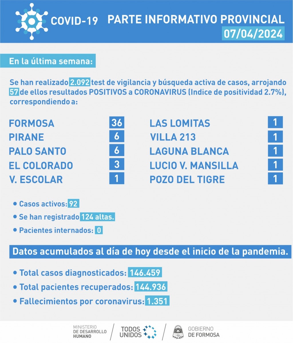 El Ministerio de Desarrollo Humano de Formosa, informó que en la última semana se han realizado 2.092 test de vigilancia y búsqueda activa de casos, arrojando 57 resultados positivos a coronavirus, con un índice de positividad 2.7%.