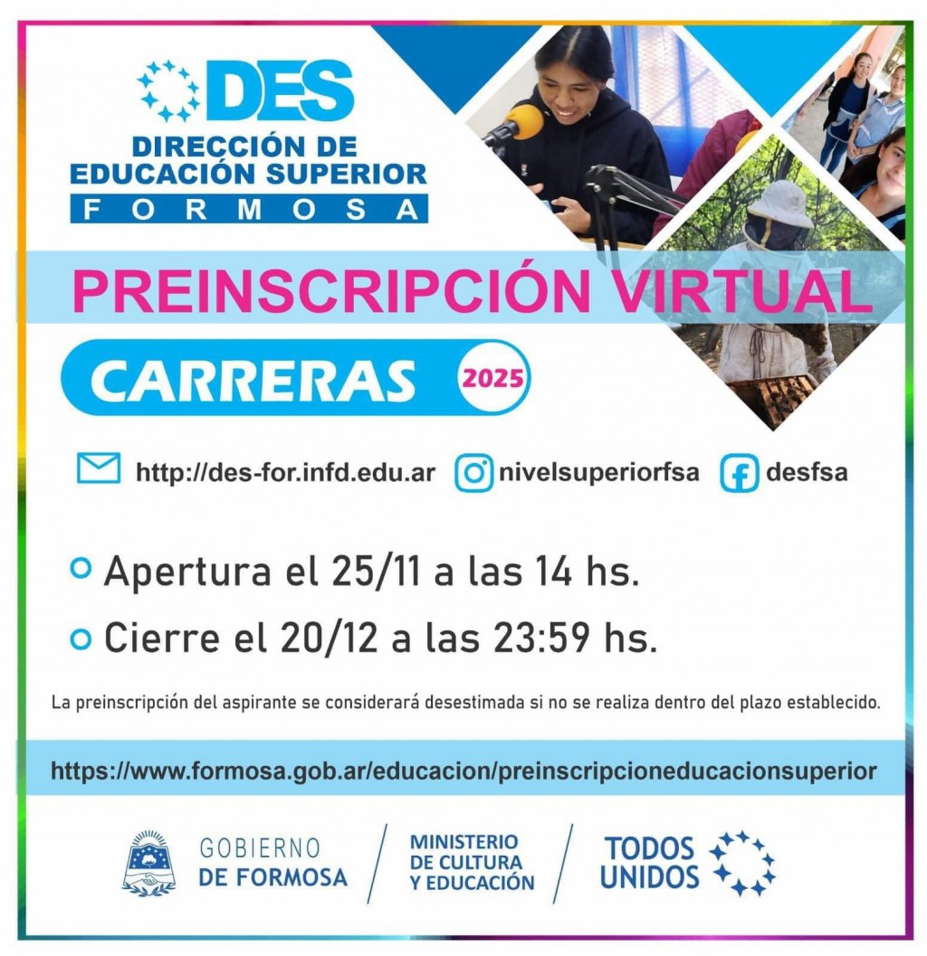 Los interesados deben visitar https://www.formosa.gob.ar/educacion/preinscripcioneducacionsuperior .