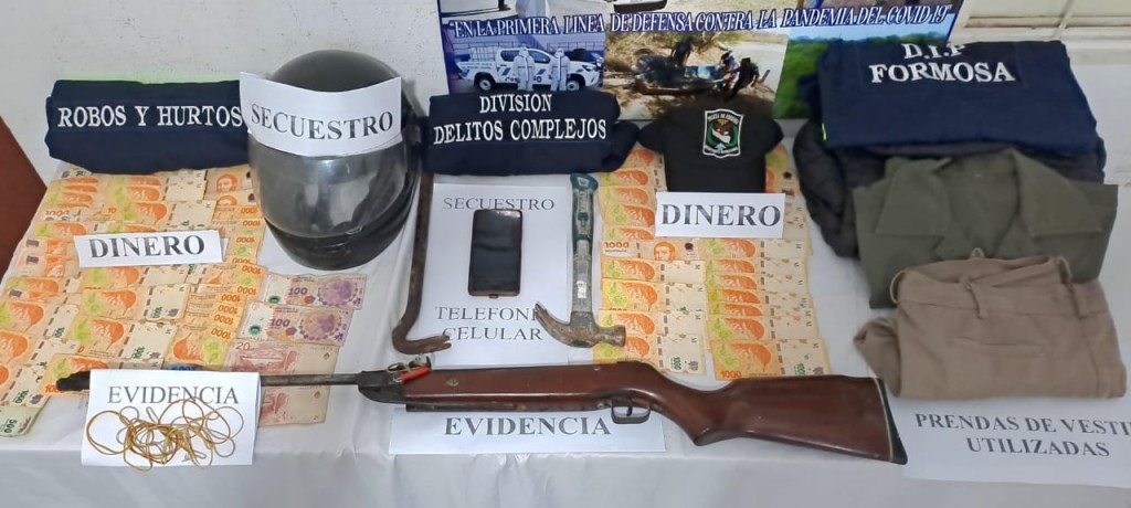 Efectivos de la Sección Delitos Complejos del Departamento Informaciones Policiales secuestraron una importante suma de dinero en efectivo, prendas de vestir y elementos idóneos utilizados para consumar un robo bajo la modalidad “rompecristales” y un rifle de aire comprimido calibre 22.