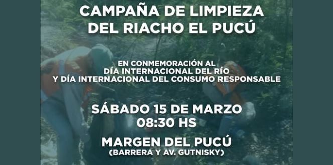Puede ser una imagen de 1 persona y texto que dice "UNITE A LA CAMPAÑA DE LIMPIEZA DEL RIACHO EL PUCÚ EN CONMEMORACIÓN AL DÍA INTERNACIONAL DEL RÍO Y DÍA INTERNACIONAL DEL CONSUMO RESPONSABLE SÁBADO 15 DE MARZO 08:30 HS MARGEN DEL PUCÚ (BARRERA Y AV. GUTNISKY) Para Más info: 3704525595 ¡TE ESPERAMOS! 80 Ciudad Sostenible For mo uO JORGE JOFRE inlendenle ciudad"
