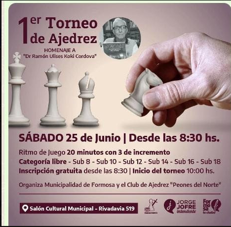 La Subsecretaría de Deporte, Cultura y Turismo de la comuna capitalina y el Club de Ajedrez “Peones del Norte” invitan a la comunidad a participar del 1° Torneo de Ajedrez, homenaje a “Dr. Ramón Ulises ‘Koki’ Cordova”, el cual tendrá lugar este sábado, en las instalaciones del Centro Cultural Municipal.
