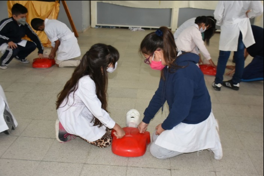 “Así lo conversamos con los chicos de 5to y 6to grado, porque ya tienen la fuerza suficiente para presionar el pecho entre 5 y 6 centímetros”, argumentó.