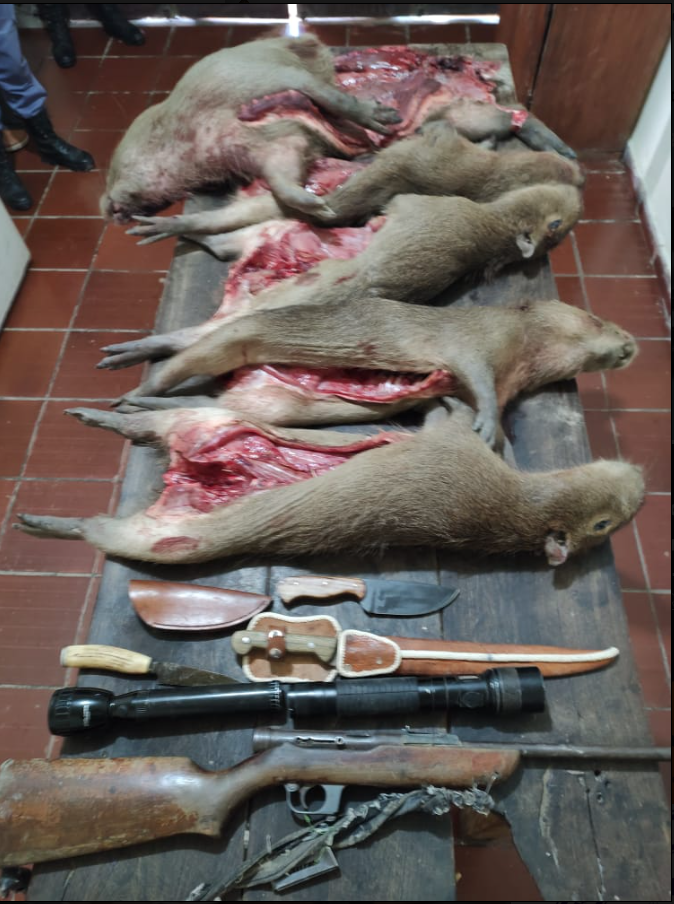 Al verificar la embarcación, constataron que trasladaban un arma de fuego tipo rifle calibre 22 largo, con su respectivo cargador colocado y cuatro cartuchos del mismo calibre, dos linternas, tres armas blancas, cinco carpinchos faenados, entre otros elementos utilizados para la caza furtiva.