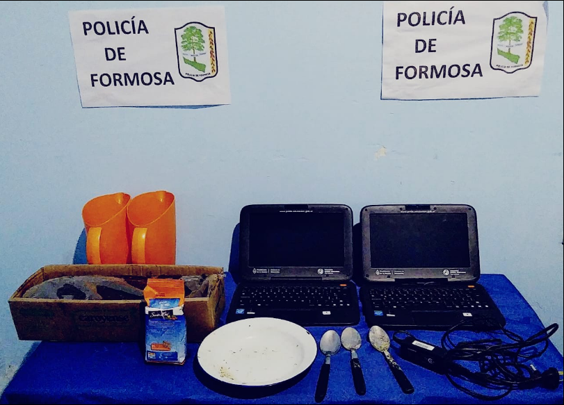 Efectivos policiales recuperaron computadoras y utensilios sustraídos de la Escuela Provincial de Educación Primaria (EPEP) Nº 295 de la Colonia Riacho de Oro, distante a unos ocho kilómetros de Subteniente Perín.