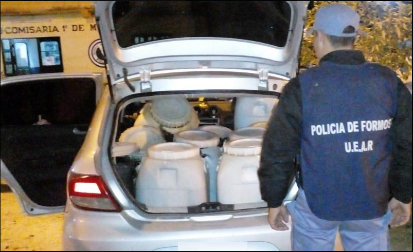Al detener la marcha, se identificó a dos hombres en su interior de 27 y 18 años. Al solicitarles que exhiban lo que trasportaban, se encontraron con 12 bidones de combustible (nafta), haciendo un total de 600 litros.