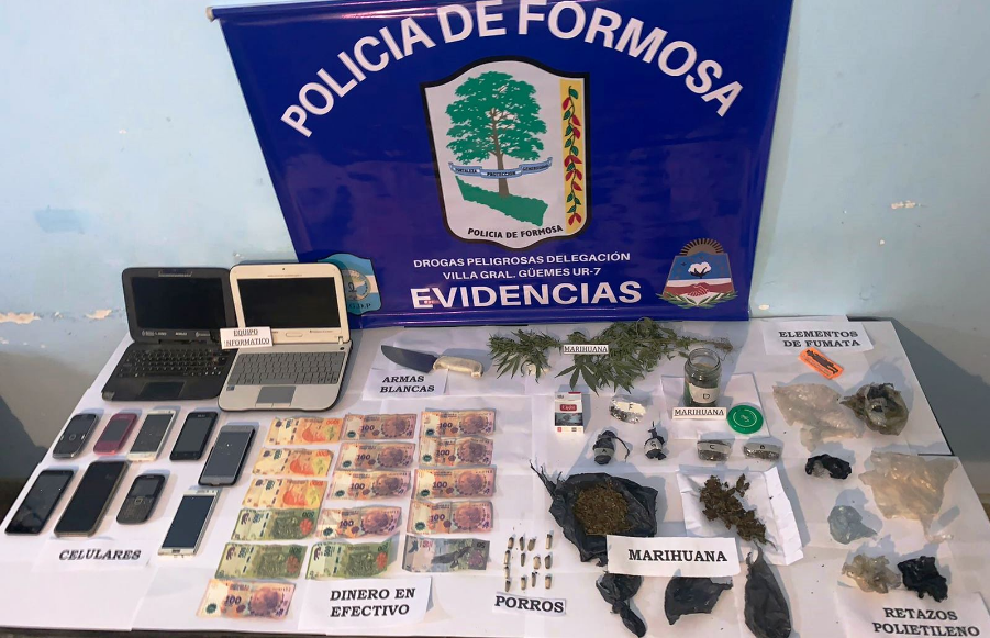 En el lugar detuvieron a un joven de 19 años y secuestraron dos plantas de marihuana, dinero en efectivo, un frasco de vidrio conteniendo en su interior marihuana, ocho envoltorios con marihuana acondicionados para su comercialización, numerosos cigarrillos de fabricación casera parcialmente consumidos, retazos de polietileno transparentes, papel carbónicos y cintas de embalar, varios gramos de marihuana, dos netbook, la cantidad de nueve teléfonos celulares, y un arma blanca, entre otros elementos de interés a la causa.