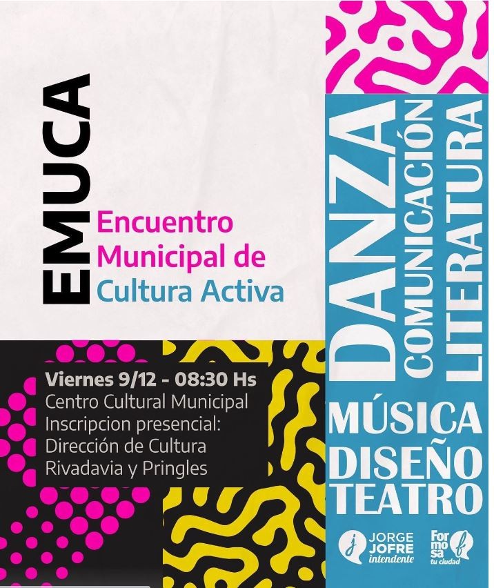 La Subsecretaría de Deportes, Cultura y Turismo de la Municipalidad local convoca a trabajadoras y trabajadores de la cultura local para el Encuentro Municipal de Cultura Activa (EMUCA), el que se llevará a cabo el viernes 9 de diciembre a las 8.30 hs en el Salón Cultural Municipal, sito en Pringles y Rivadavia.
