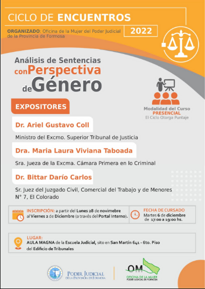 Organizado por la Oficina de la Mujer del Poder Judicial de la Provincia de Formosa se realiza este martes 6 el encuentro presencial correspondiente al “Ciclo de Encuentros: Análisis de sentencias con Perspectiva de Género”. Entre otros disertará la Dra. Viviana Taboada, jueza de la Excelentísima Cámara Prinera en lo Criminal de Formosa, presidenta del Colegio de Maistrados de la provincia y secretaria de Políticas Judiciales de la Federación Argentina de la Magistratura y la Función Judicial FAM.