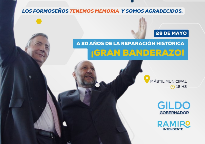 “Para un gran encuentro de la militancia, porque tenemos memoria y somos agradecidos, convocamos el domingo 28 de mayo a las 18 horas en el acceso a la costanera “Vuelta Fermosa” a todas los compañeros y compañeras peronistas, a recordar con alegría el 20 aniversario de la visita histórica de Néstor Kirchner y la Firma de Reparación Histórico con el Gobernador Gildo Insfrán” manifestó.