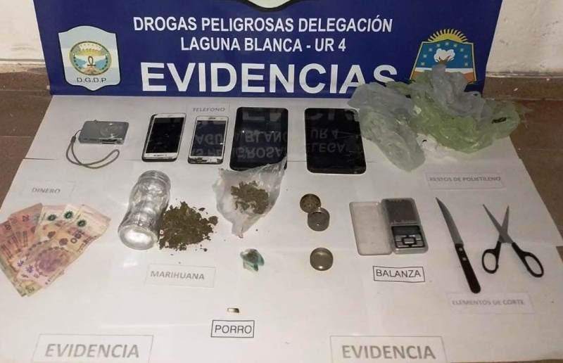 Tras dos allanamientos en viviendas del barrio Centenario de Laguna Blanca, se secuestró marihuana, plantines del mismo estupefaciente, celulares, cámara digital, balanza, picadores, dinero y otros elementos