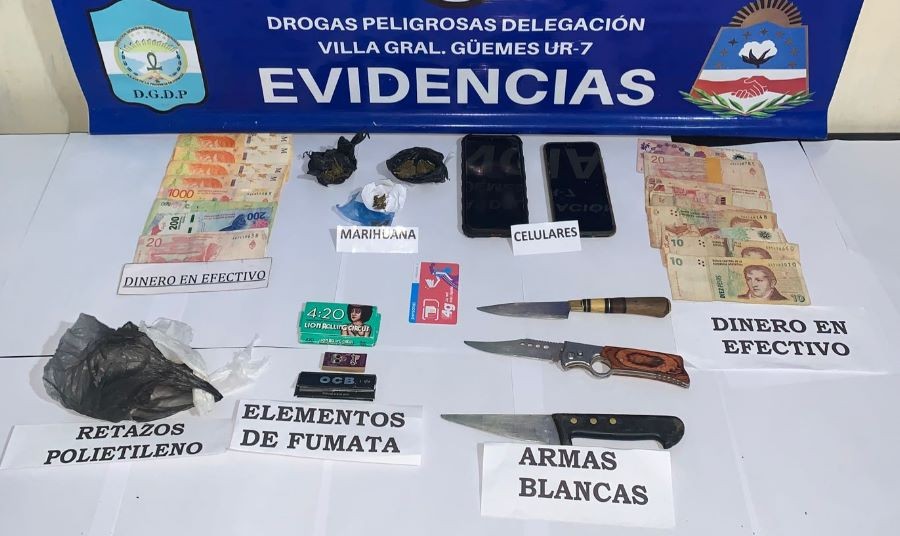 Allí secuestraron dinero en efectivo de distintas denominaciones, dos equipos de telefonía celular, elementos de almacenamiento, cuchillos con restos de marihuana y bolsitas de polietileno, entre otros.