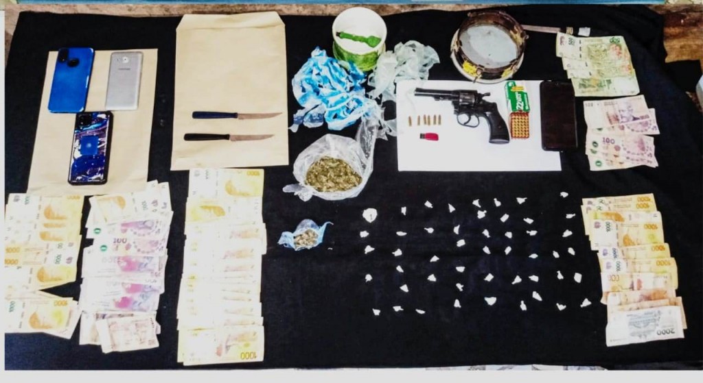 También incautaron varios gramos de marihuana, un revólver calibre 22, 41 municiones, dinero, teléfonos celulares y otros elementos de prueba. Hay dos detenidos